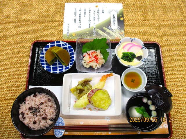 ・赤飯・季節の天ぷら(エビ、舞茸、さつまいも)・新レンコンのなます・茶碗蒸し・鯛つみれのお吸い物・今川焼き(抹茶)