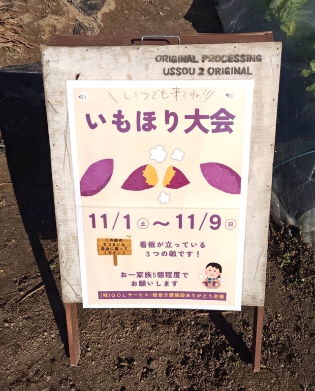 11月1日(土)~11月6日(木)まで、ありがとう農園で「いもほり大会」を開催しました!ありがとう農園で育ったさつまいもを、みんなで楽しく収穫しました。土の中から顔を出した大きなおいもに、子どもたちも大喜び!自然の恵みに感謝しながら、秋の実りを感じるひとときとなりました。